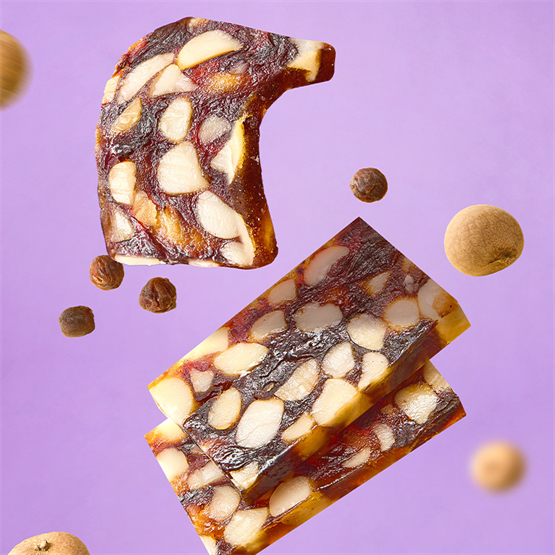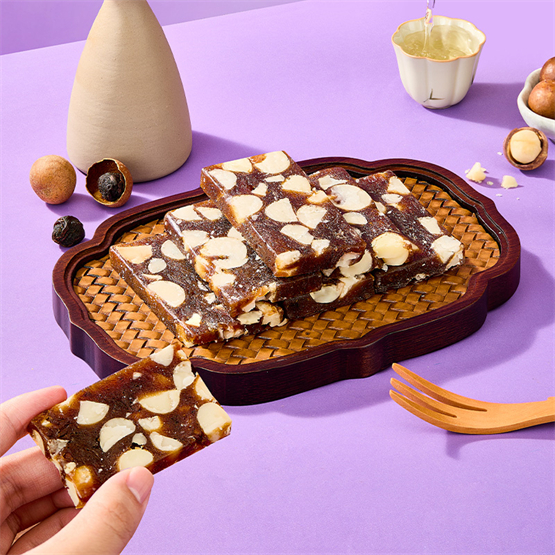 桂圆是传统饮食文化中的珍贵食材。元祖贵圆糕选用泰国进口龙眼蜂蜜与饱满桂圆肉,入口醇香清甜。同时,产品特别融入澳洲进口夏威夷果仁,松脆可口,自带天然奶香,与桂圆的软糯质地形成丰富层次,达成“香酥软糯,甜而不腻”的味觉体验。