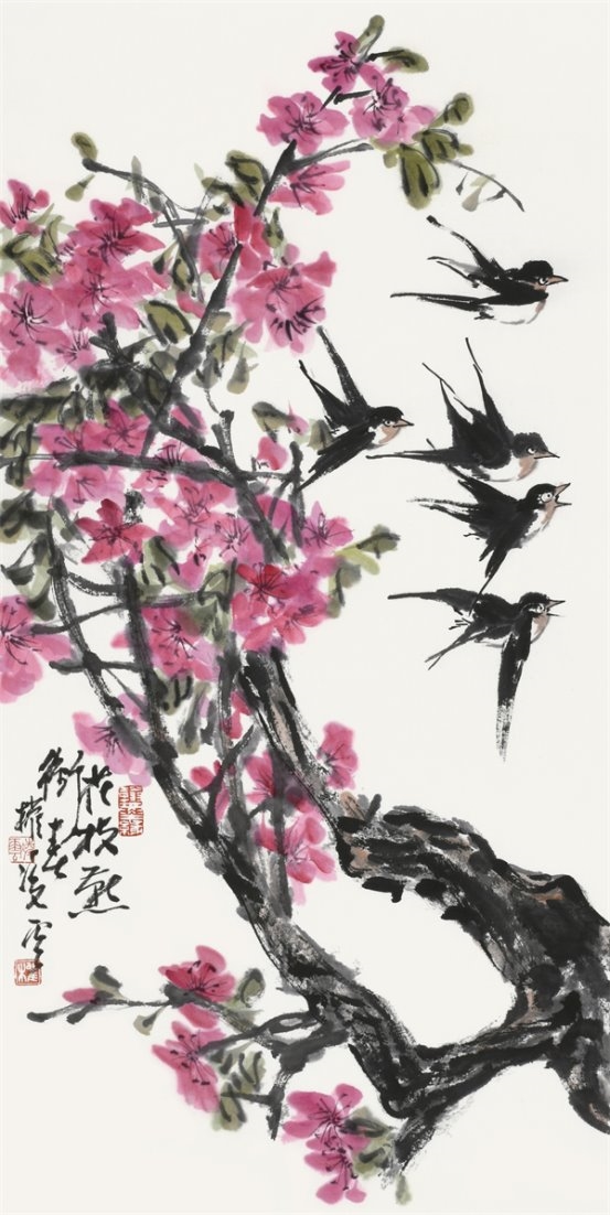 在技法与色彩运用上,权凌云完美诠释了“色足墨饱、艳而不俗”的内涵。“色足”体现在他对色彩的大胆运用——他不排斥鲜艳的色彩,画桃花用浓粉,画凌霄花用艳红,画菊花用明黄,但这些色彩并非杂乱堆砌,而是经过精心调配与布局:如在一幅《春日图》中,他以粉红画桃花,以嫩绿画枝叶,却在花瓣边缘晕染淡墨,在枝叶缝隙留白,让色彩既有“饱和感”,又不失通透;“墨饱”则体现在他对墨色的重视——他以浓墨勾勒花卉的枝干与叶片的脉络,用淡墨晕染花瓣的层次,用枯墨表现老枝的苍劲,墨色的浓淡干湿与色彩相互映衬,让画面既有色彩的绚烂,又有墨韵的深沉,避免了纯色彩画的“艳俗”与纯水墨画的“单调”。