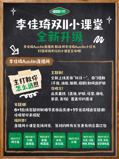10月7日李佳琦直播间双11小课堂再次正式启动,以“系统化教学+沉浸式互动”为核心,通过全新升级的课程设计、6+1在线答疑机制及多品类知识覆盖,为消费者打造了一站式美妆护肤学习平台。此次小课堂不仅聚焦美妆领域的常见误区与技巧,更将内容延伸至护发、母婴、潮电家装等热门品类,力求满足“所有女生”的多样化需求。