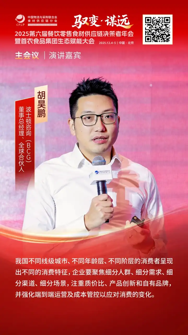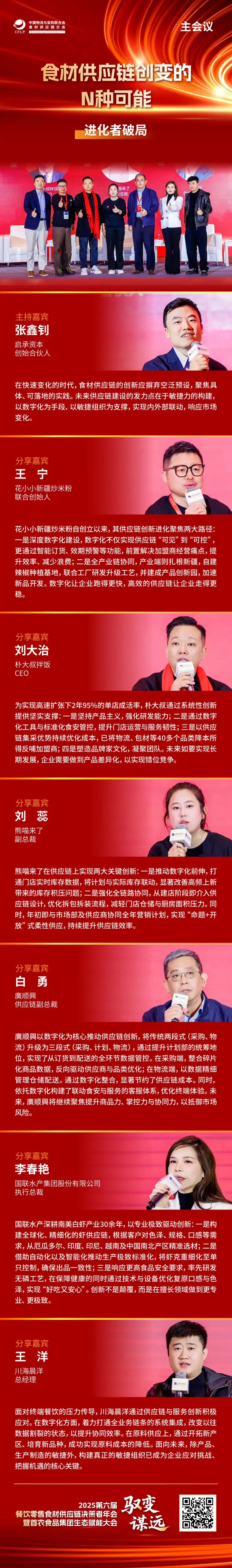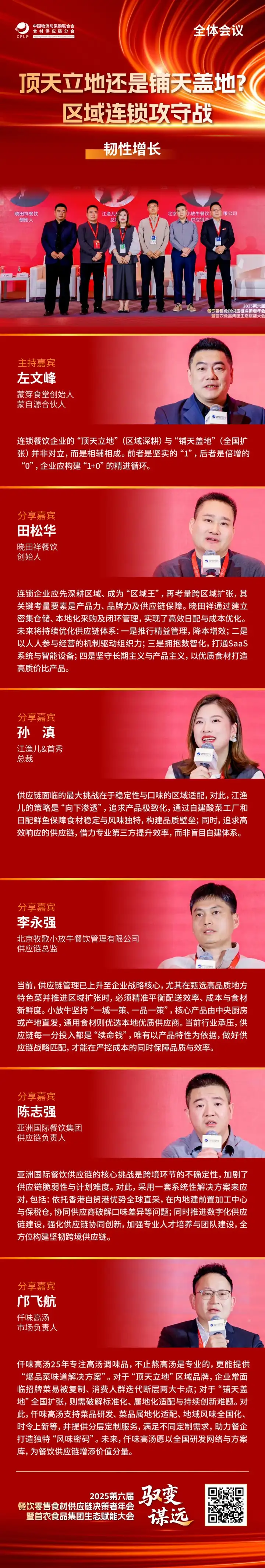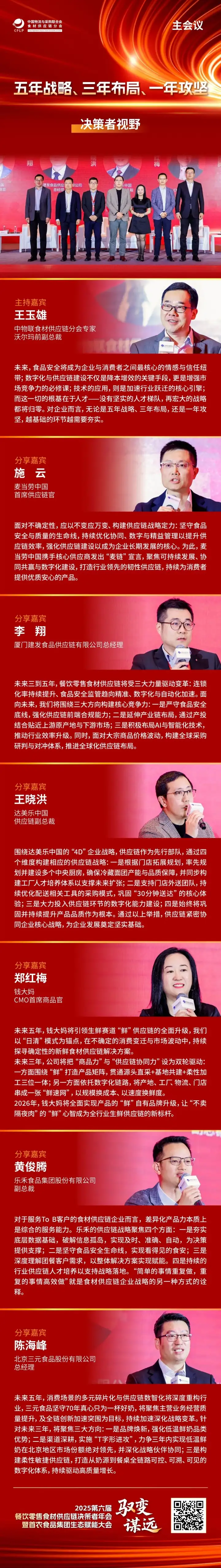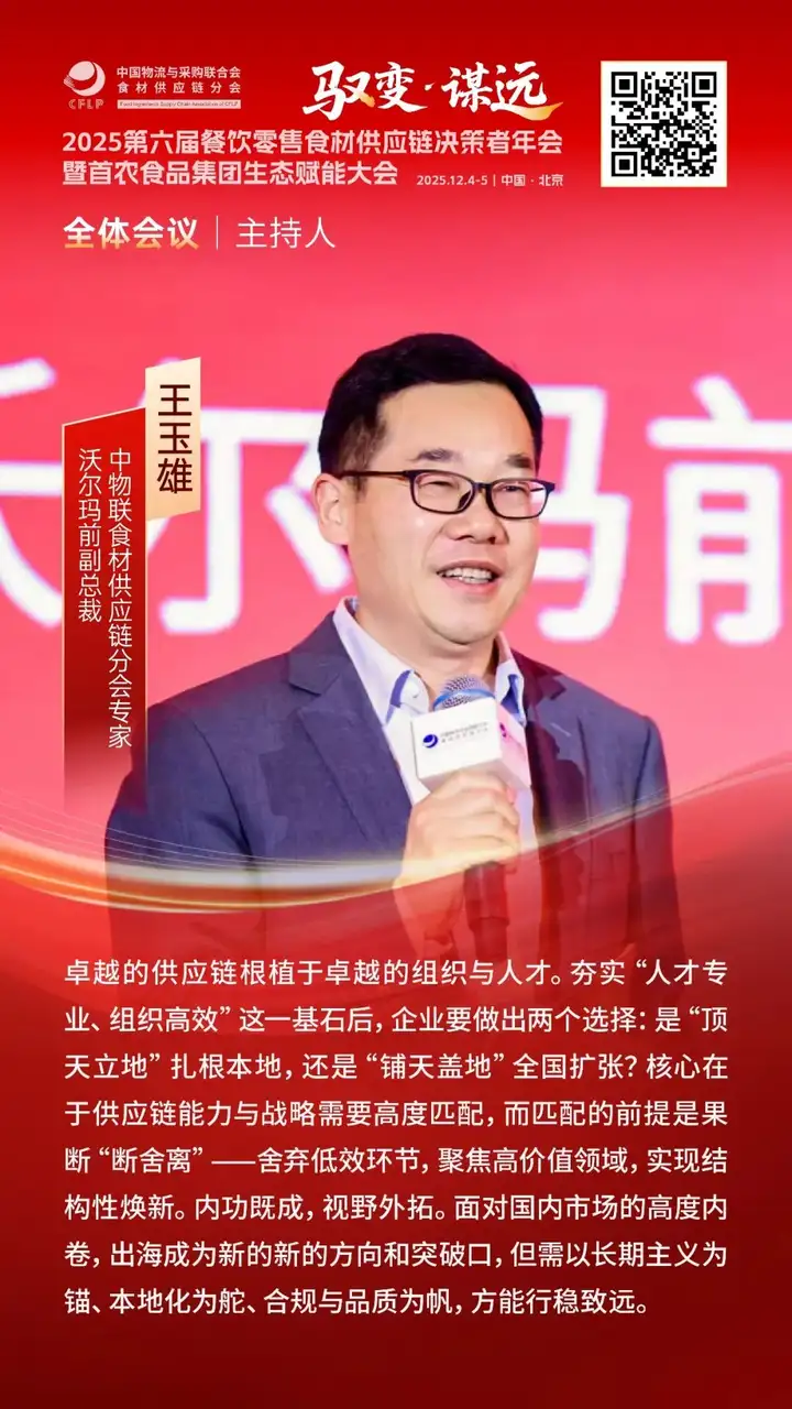 下午的全体会议精准锚定细分赛道,以实战路径探索与系统重构升级为核心,围绕数智驱动下餐饮零售食材供应链的“效率革命”、“组织进化”中的人才引擎构建、“韧性增长”视角下的区域连锁攻守战、“供应链蜕变”进程中的“断舍离”与“焕新生”、以及“出海下一站”蕴藏的市场红利等核心议题,展开深度对话与智慧交锋。全体会议由中国物流与采购联合会食材供应链分会专家&沃尔玛前副总裁王玉雄主持。