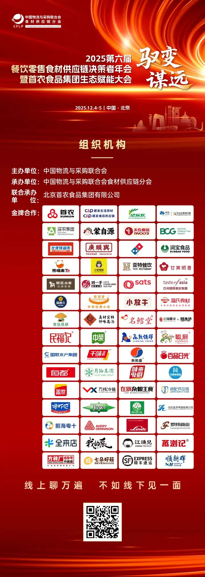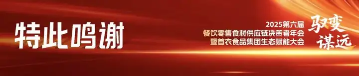 本次“2025第六届餐饮零售食材供应链决策者年会暨首农食品集团生态赋能大会”得到了北京首农食品集团、建发生活资材/建发食品供应链、天农食品、仟味高汤、江西馋虾记农业集团、江苏润宝食品、味来央厨、温氏食品、方砖厂69号炸酱面、在旗生态食品、民福记、飞熊领鲜、新和盛、中农食迅、比泽尔、万纬物流、绝配柔性供应链、华鼎冷链、中交冷链、艾利丹尼森、顺新晖、前海粤十、全来店等单位的大力支持!