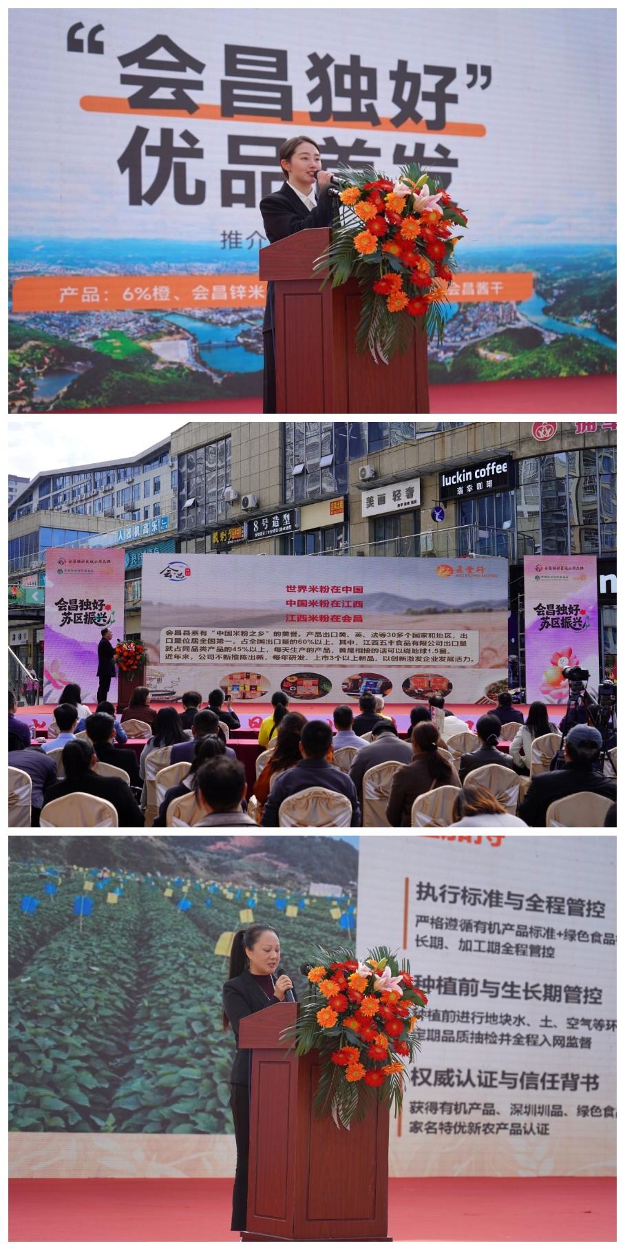 随后的“独好优品”系列产品推介将活动推向高潮。会昌锌米、6%橙、江西米粉、剁椒鸭爪、柠檬香橙、高山蜜薯、会昌桔柚、会昌酱干等来自会昌本土企业的优质产品一一亮相。各企业代表通过生动讲解与图片展示,向与会嘉宾全方位呈现了产品的独特品质与品牌故事。“百里挑六”的严选标准、“锌”意满满的健康理念、传承古法的制作工艺,引得现场赞叹连连,掌声不断。