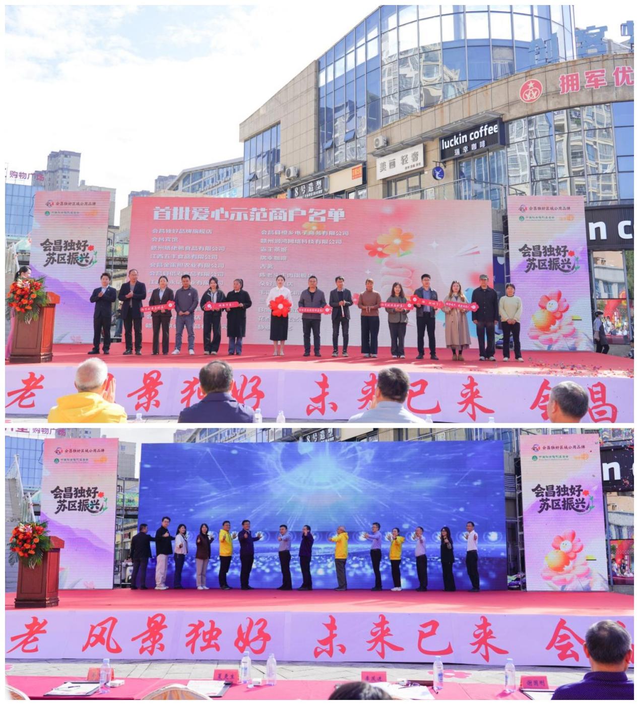 在与会领导嘉宾的共同启动下,“小红花”标识点亮屏幕,标志着这一连接城乡、汇聚爱心的可持续公益新模式在会昌落地生根,首批24户爱心商家代表上台合影并向大家作出了公益呼吁。