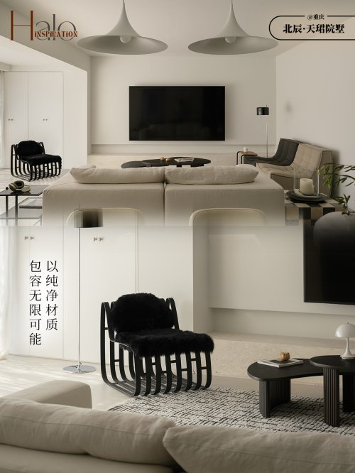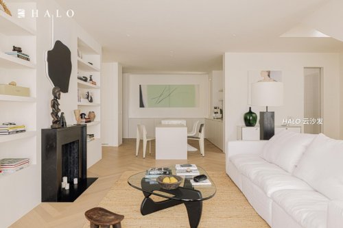 整体空间以纯净的白色为基调,却通过卡地亚大理石的冷冽、洞石岩板的粗粝、老木横梁的温润等材质对比,构建出丰富的视觉层次。而HALO云沙发作为空间中的白色主角,不仅完美诠释了"少即是多"的设计真谛,更以独特的舒适哲学,为现代家居设计提供了全新的思考维度。
