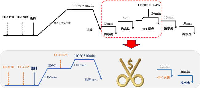 上图:锦纶常规染色、固色工艺;下图:锦纶染固一体工艺