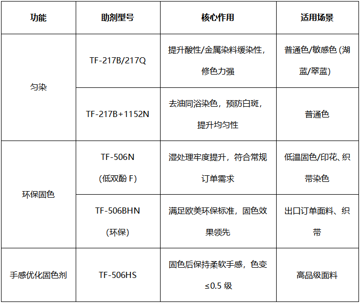 ②功能整合技术:环保固色剂保障色牢度;缸内同步实现抗紫外/吸湿/防酚黄功能