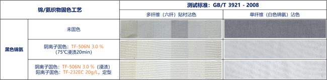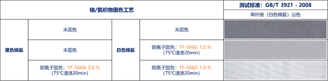 传化给出了两套解决方案:①采用传化的阴离子型-酸性固色剂TF-506N和阳离子型-无醛固色剂TF–232EC进行染色织物的“阴/阳双固”固色工艺;②采用传化的酸性固色剂TF-506N进行染色织物固色、酸性固色剂TF-506G进行白色织物固色。通过上述两种方案固色而制成的拼白衣物,拼白色牢度不达标的问题得以解决。