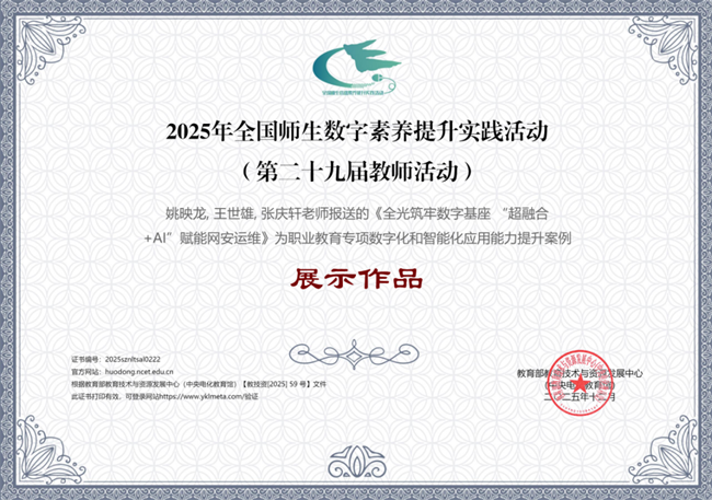 近日,由信锐支持、协同云南交通职业技术学院共同提报的数字化建设案例——《全光筑牢数字基座“超融合+AI”赋能网安运维》,在教育部中央电化教育馆组织的评选中,成功入选“职业教育专项数字化和智能化应用能力提升案例展示作品”!