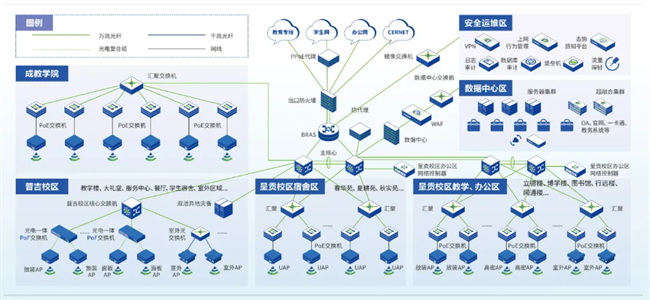 针对学校实际需求,信锐为云南交通职业技术学院量身打造了“全光网络+AI智能运维”一体化解决方案,涵盖“云、网、端、安、维”全场景,助力学校实现网络架构与运维模式的双重变革,形成“万兆骨干、千兆桌面”的“全光网数字化智能网络体系”,整网建设如下图: