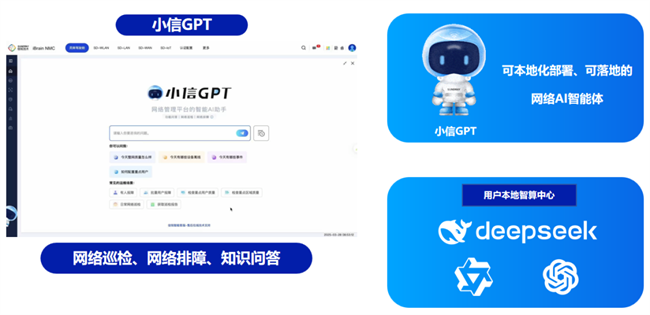 学校采用信锐全网智能2.0,实现全网设备的智能化管理。同时部署小信GPT网络AI智能体,实现在网络巡检、故障定位、知识问答等三大运维场景的自然语言交互式运维(图三),帮助运维人员快速知晓故障信息、识别故障原因、获取网络动态信息等,显著提升了运维效率。