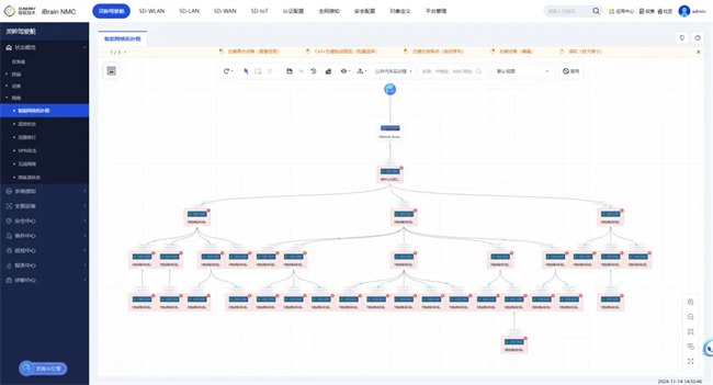 信锐网络管理平台采用SDN转控分离架构,将所有管理、命令、控制的功能集中在网络控制器上,具备全网设备可视化、自动生成拓扑及云网端融合能力(图四),助力校园网高效便捷式运维管理。通过控制器下发配置,可帮助用户和终端快速开通网络,实现业务系统的快速上线,精准定位师生终端设备位置。