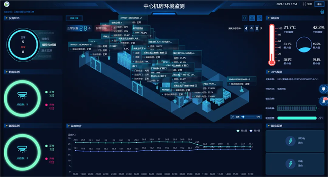 中心机房采用智能3D引擎及数字化孪生技术(图五),充分利用物理模型、传感器更新、运行历史等数据,在数字空间中精准还原了实体机房的物理环境与运行状态,实现了从设备部署到运维管理的全生命周期可视化监控与智能分析。